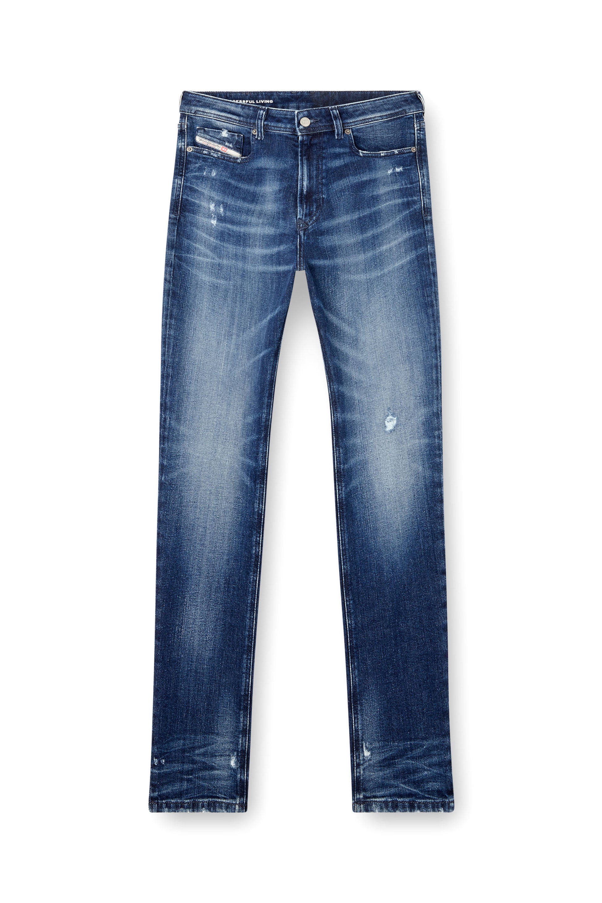 Este denim elástico azul oscuro forma parte de la gama de ADN de Diesel. Presenta pequeñas erosiones y bigotes de gato visibles que realzan su profundidad y textura. Hecho con un porcentaje de algodón reciclado.