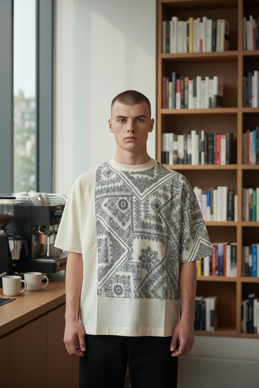 Inspirado en los años 70 y 80, el aspecto retro es una fuente de inspiración en la colección. La camiseta está confeccionada con el mejor algodón con una silueta relajada y ligeramente Oversized y un estampado de cachemira en el pecho y la espalda.